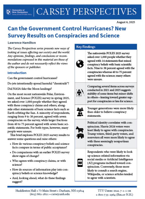 - Hamilton, L.C. 2022. “Conspiracy vs. science: A survey of U.S. public beliefs.” Durham, NH: Carsey School of Public Policy. https://dx.doi.org/10.34051/p/2022.08